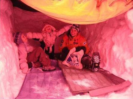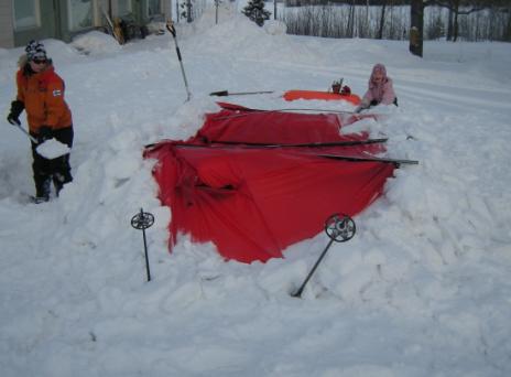 Jos mahdollista, kannattaa suojaksi rakentaa ennemmin lumimajoite, jossa on paremmin tilaa ja joka suojaa tuuleltakin paremmin. Tarvittaessa lumimajoitteessakin voi kaivautua tuulisäkin suojaan. Lumirakennusta helpottamaan mukaamme lähtee lumisaha ja kaksi lapiota. Rakensimme lumimajoitteen lumilohkareiden avulla yhdessä naapurin lasten kanssa.